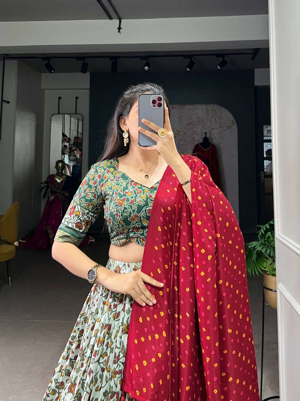 Blooming Elegance: Tussar Silk Floral Print Lehenga with Bandhej Dupatta