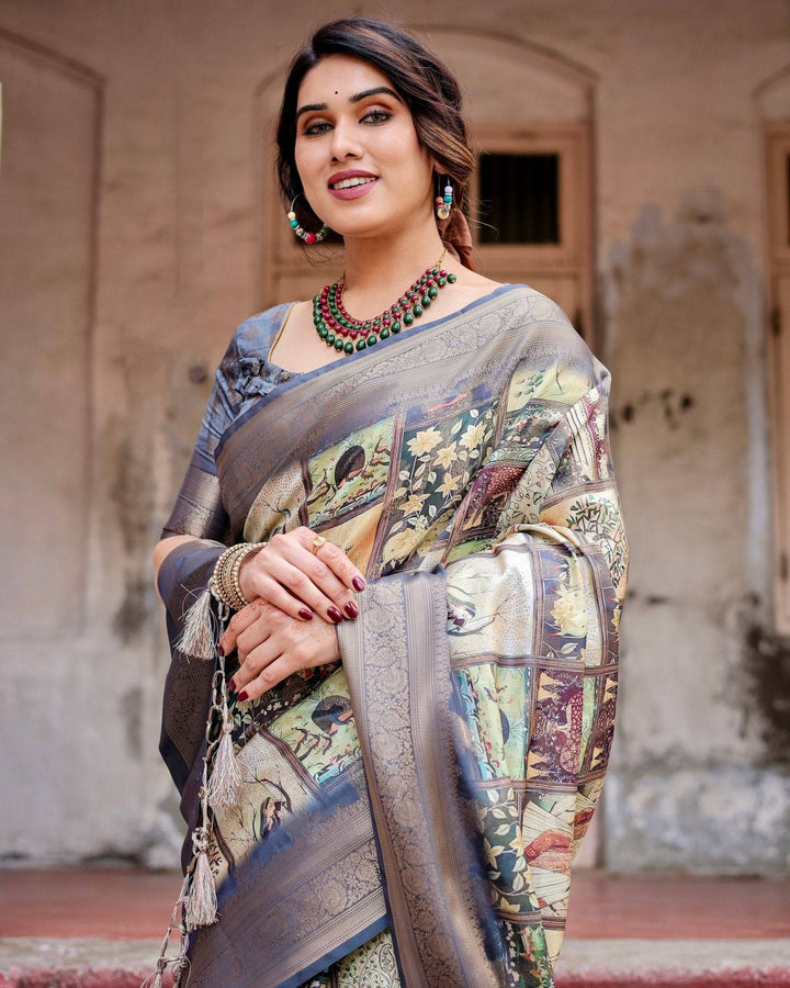 Elevate your ethnic collection with this pure Banarasi digitally printed silk saree, a masterpiece that seamlessly blends traditional artistry with modern sophistication.