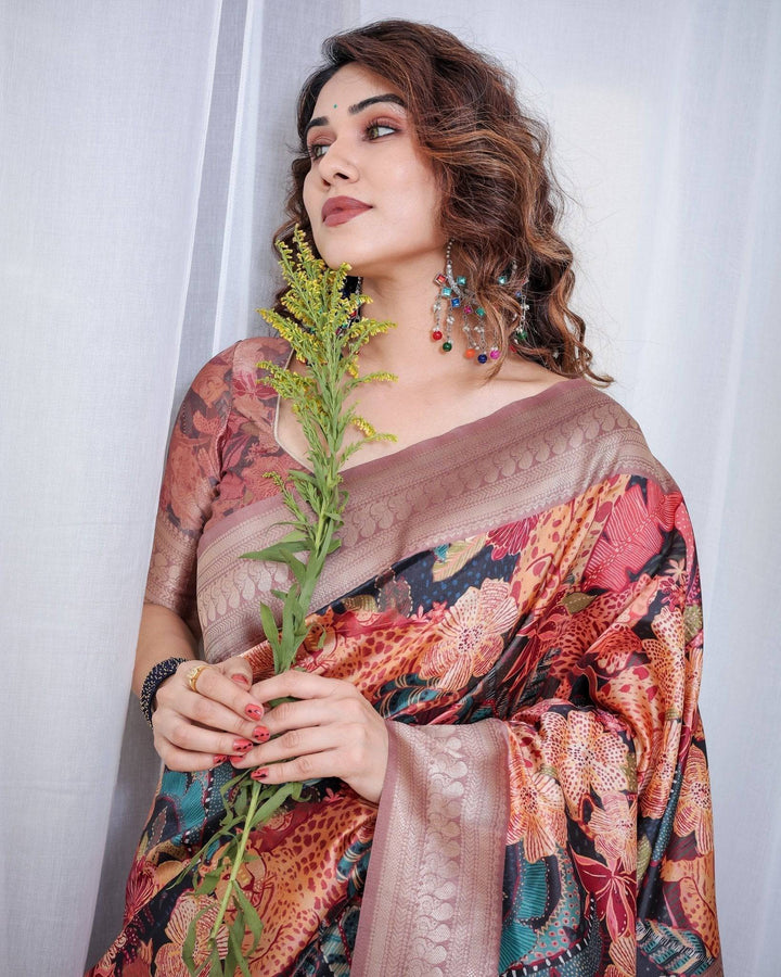 Black Banarasi Silk Saree with Exotic Leopard & Floral Digital Print, Zari Border & Tassel Pallu