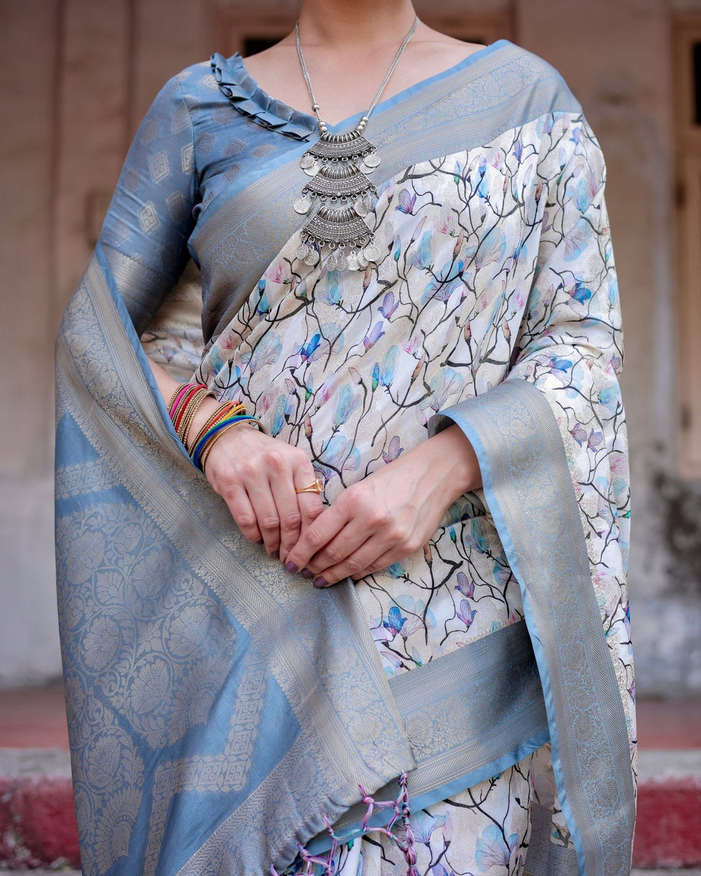 Indulge in the timeless elegance of this Banarasi silk saree, showcasing a soothing combination of sky blue and ivory adorned with a delicate floral pattern across the body. The saree's pallu features intricate zari weaving in elegant blue, adding a touch of regal charm. The tasseled hem enhances its luxurious appeal, making it a perfect choice for festive celebrations and special occasions. Draped in sophistication, this saree epitomizes traditional artistry blended with contemporary grace.