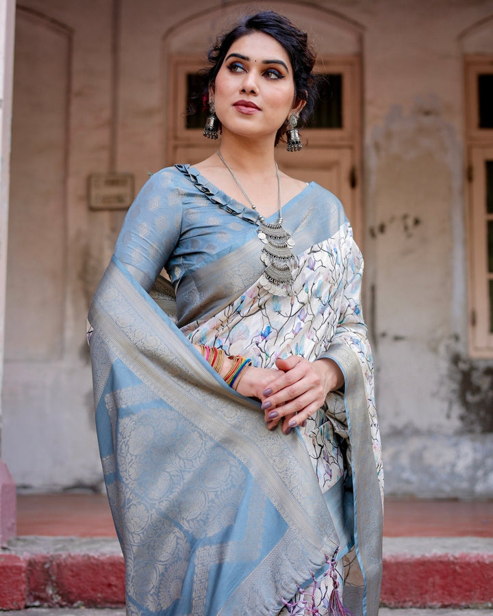 Elegant Light Blue Banarasi Silk Saree with Floral Design and Zari Weaved Pallu