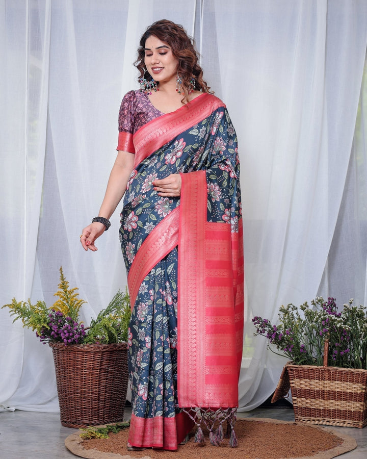 Regal Navy Blue and Pink Floral Banarasi Silk Saree with Tassels