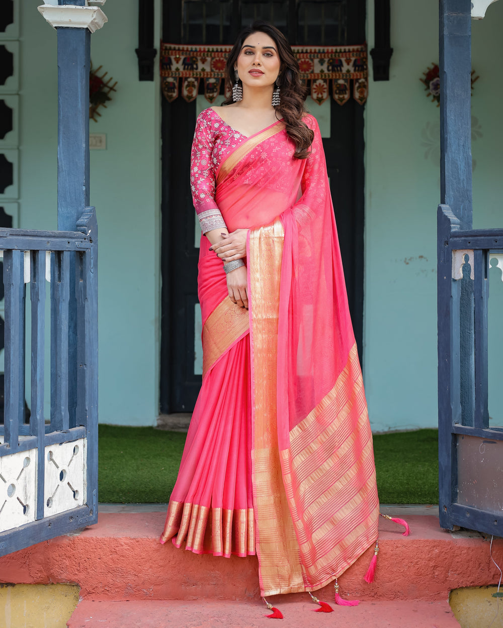 Ravishing Rani Pink Plain Chiffon Saree with Gold Zari Border, Floral Printed Blouse & Tassel Accents
