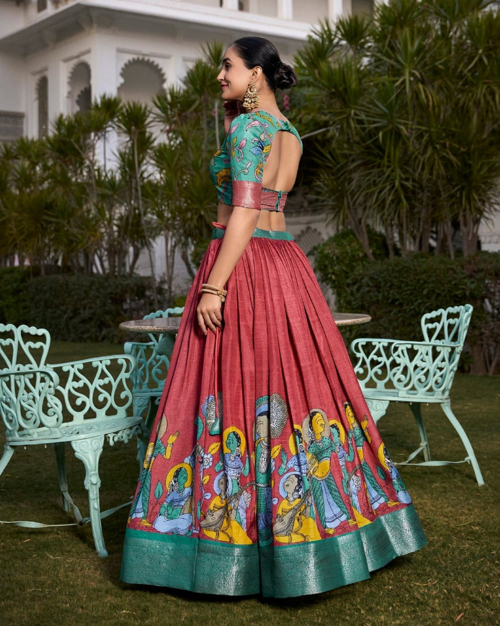 Elegant Green & Rust Kalamkari Print Dola Silk Lehenga Set