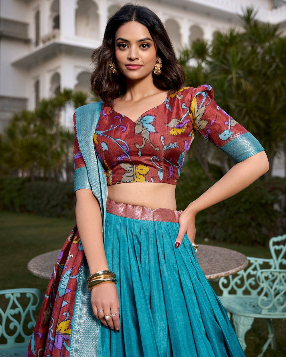 Exquisite Aqua Blue & Rust Dola Silk Kalamkari Lehenga Set with Zari Weaving Border