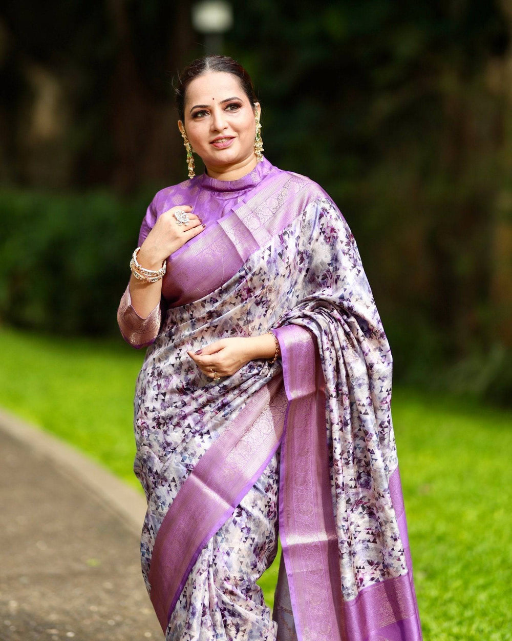 Lavender Banarasi Silk Saree with Delicate Floral Prints and Lustrous Zari Borders