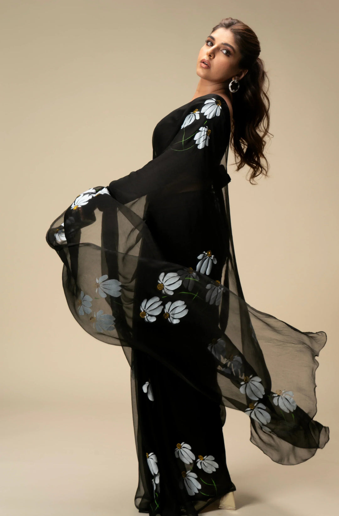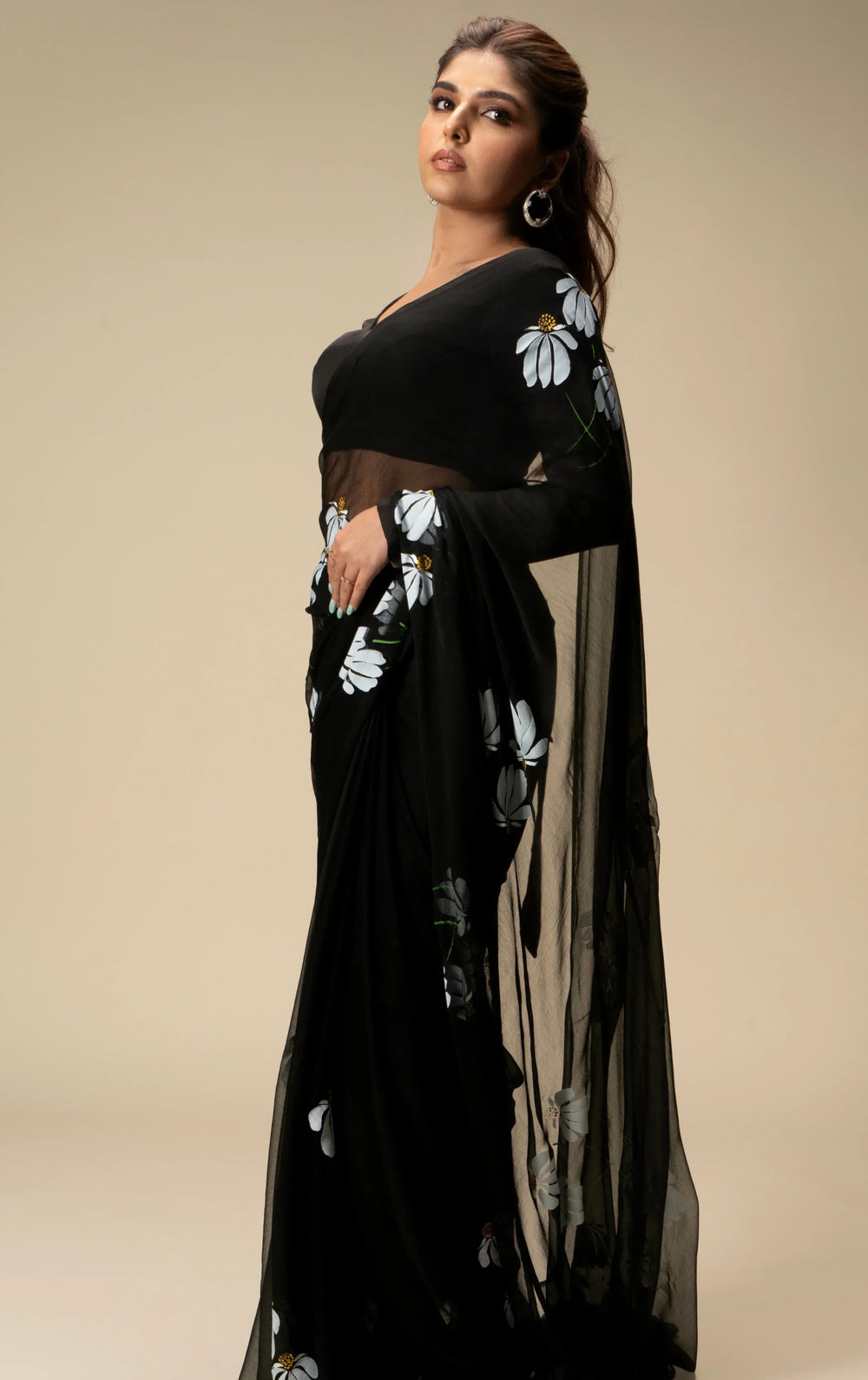 Black Hand-Painted Pure Georgette Saree with White Floral Motifs & Sequins | Modal Satin Blouse