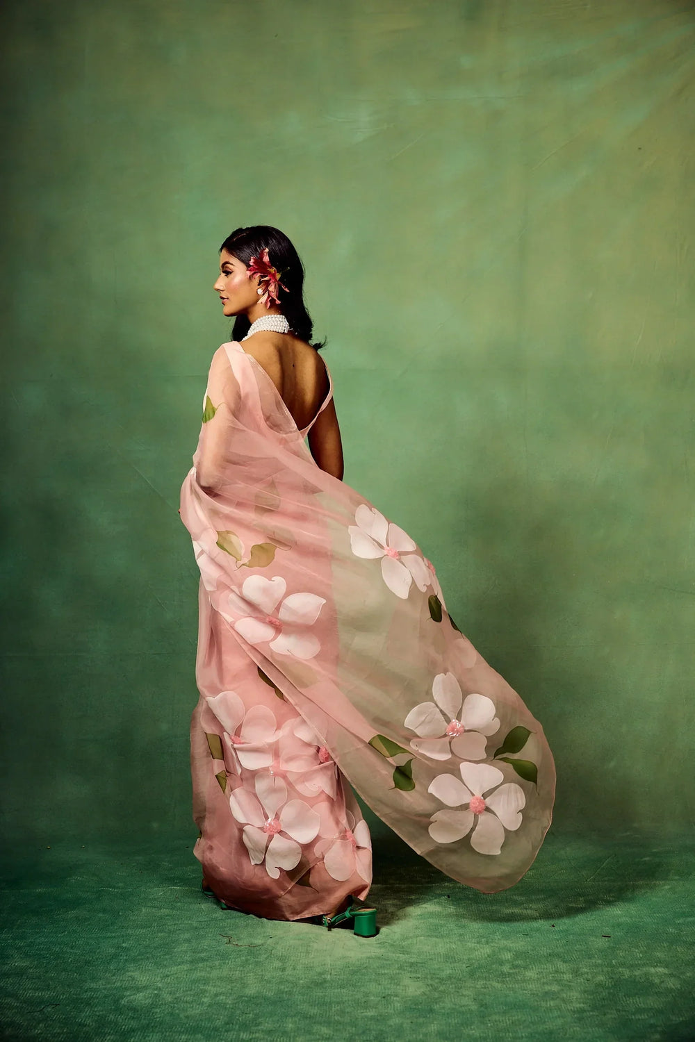 Blush Pink Pure Organza Hand-Painted Saree with White Floral Motifs & Sequins | With Modal Satin Blouse
