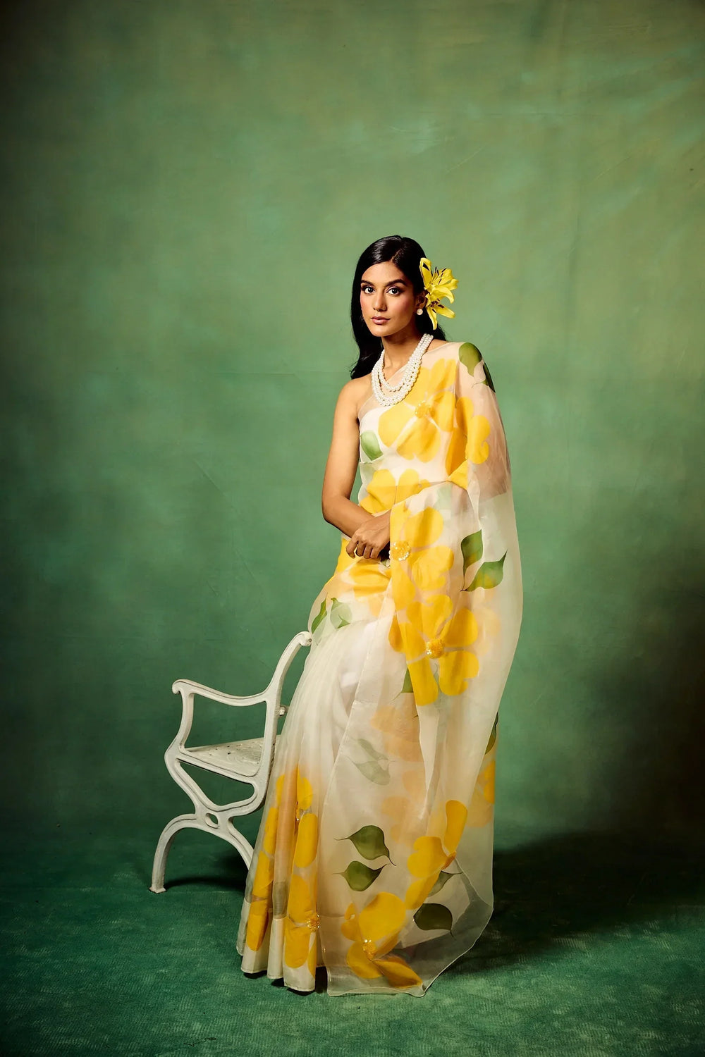 White Pure Organza Saree with Hand-Painted Oversized Yellow Floral Motifs & Sequin Accents | Satin Blouse