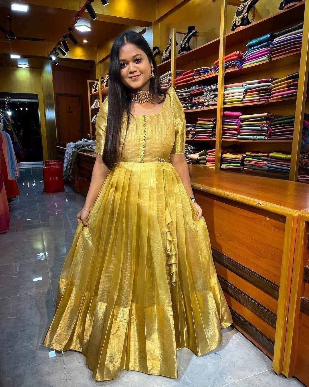 Golden Tissue Silk Gown for Women - Elegant Full-Length Party Wear Dress
