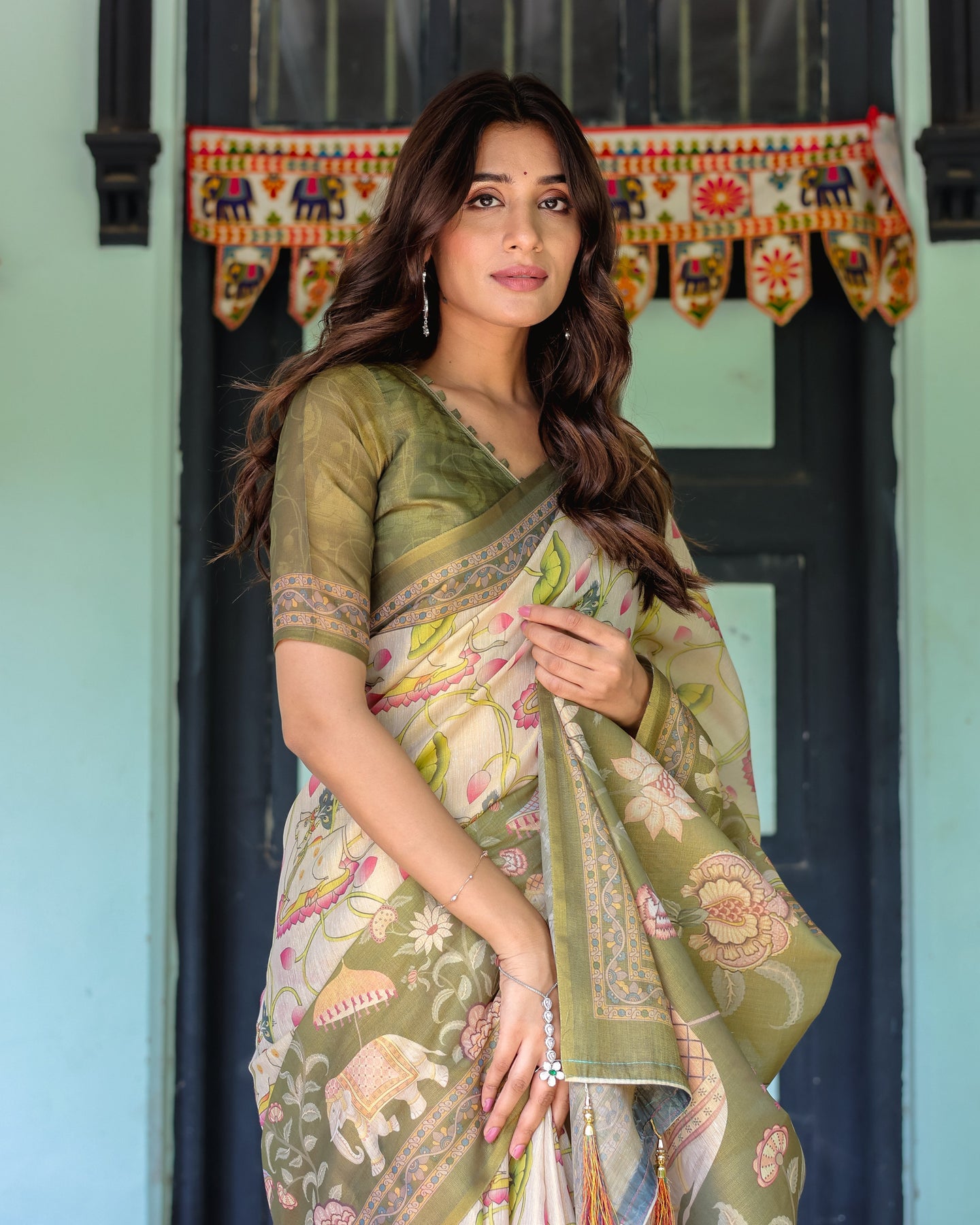 Pallu: Olive and ivory with multicolor festive motifs