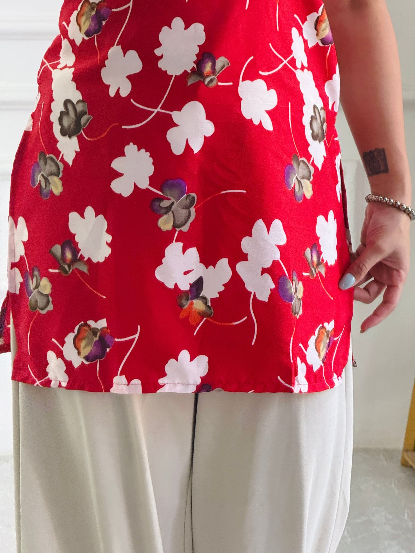 Bold Red Floral Cambric Cotton Kurti with Lace-Up Detail