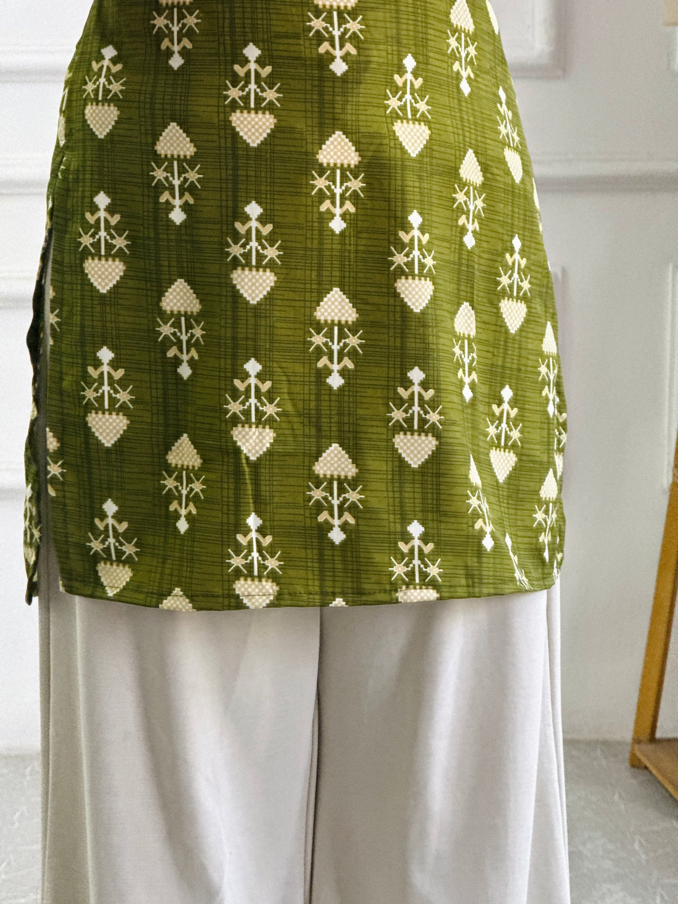 Print/Color: Olive green base with light (cream/white) geometric, ethnic-style motifs (bootis).