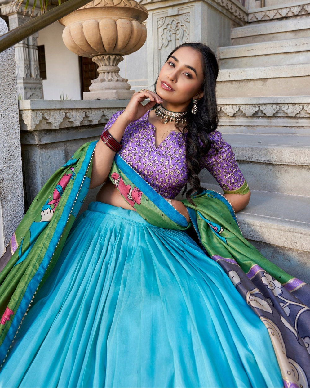 Turquoise Blue & Purple Tussar Silk Kalamkari Lehenga Choli with Elegant Foil Work