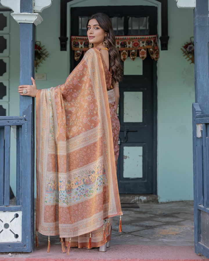Paired with a matching printed blouse and finished with elegant tassels in rust and gold, this saree strikes the perfect balance between everyday sophistication and cultural tradition.