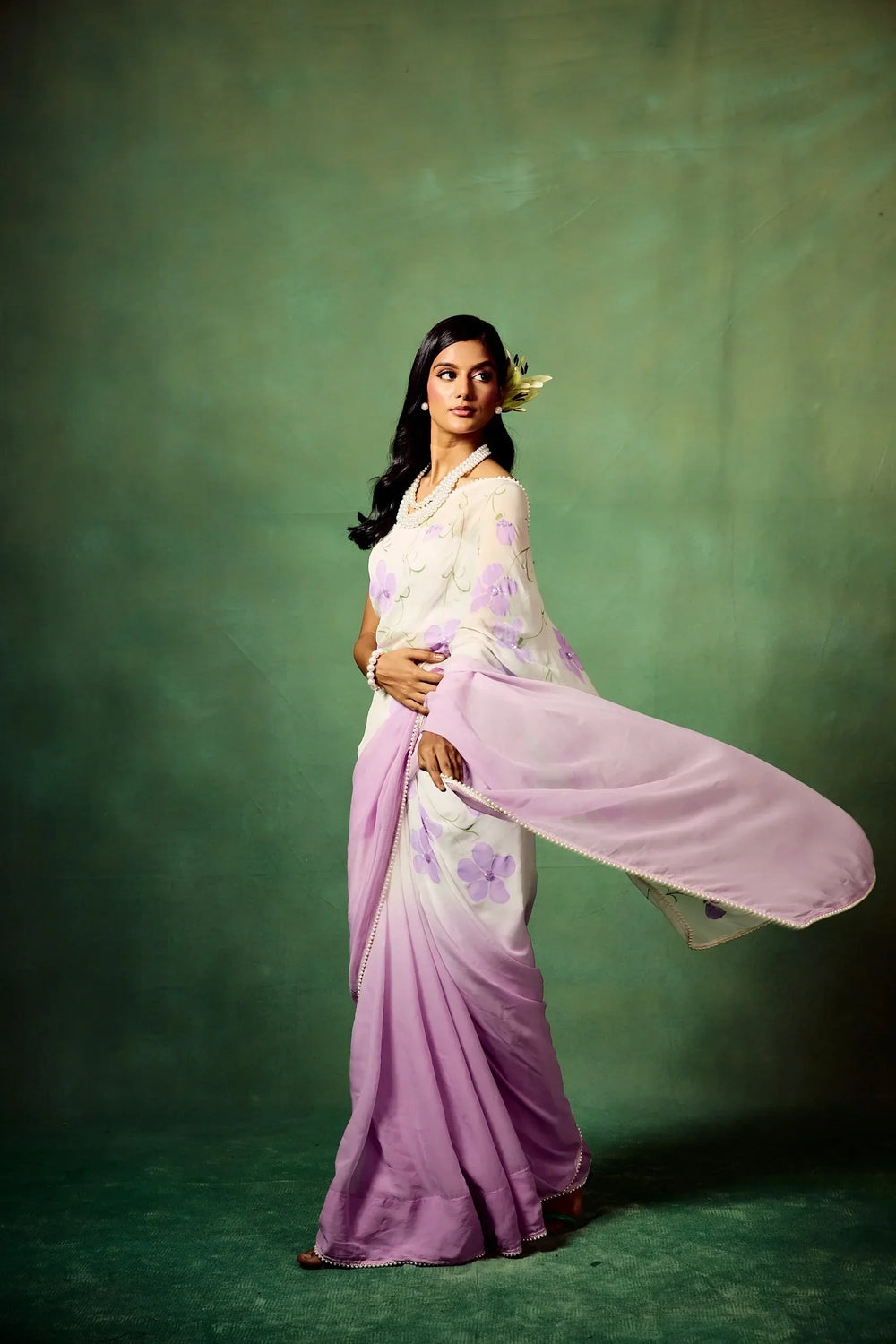 Gracefully romantic and effortlessly elegant, our Lavender Bloom pure georgette saree is a pastel dream come to life. This enchanting drape features delicate hand-painted lavender floral motifs on a soft ivory-white base, beautifully accented with subtle sequin detailing that catches the light with every movement. The pallu transitions into a solid lavender tone, creating a serene and graceful flow. Paired with a smooth modal satin blouse in a coordinating hue, this saree is perfect for daytime soirees, intimate weddings, or garden celebrations. Let your style bloom in soft elegance with this wearable piece of art.