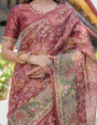 Celebrate culture with color in this Rust Red Handloom Cotton Saree, where tradition meets detailed storytelling. The body of the saree features intricate digital floral vines and birds in delicate beige and turquoise, evoking a classic folk art aesthetic.