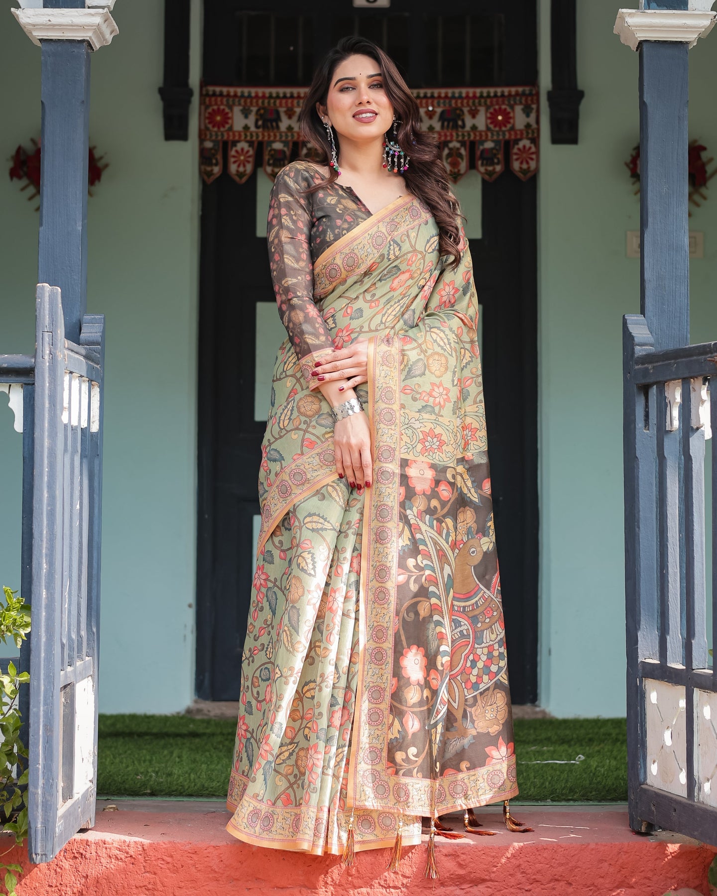 Sage Green with Bold Floral Motifs Linen Cotton Handloom Printed Saree, Vibrant Peacock Pallu, and Tassels