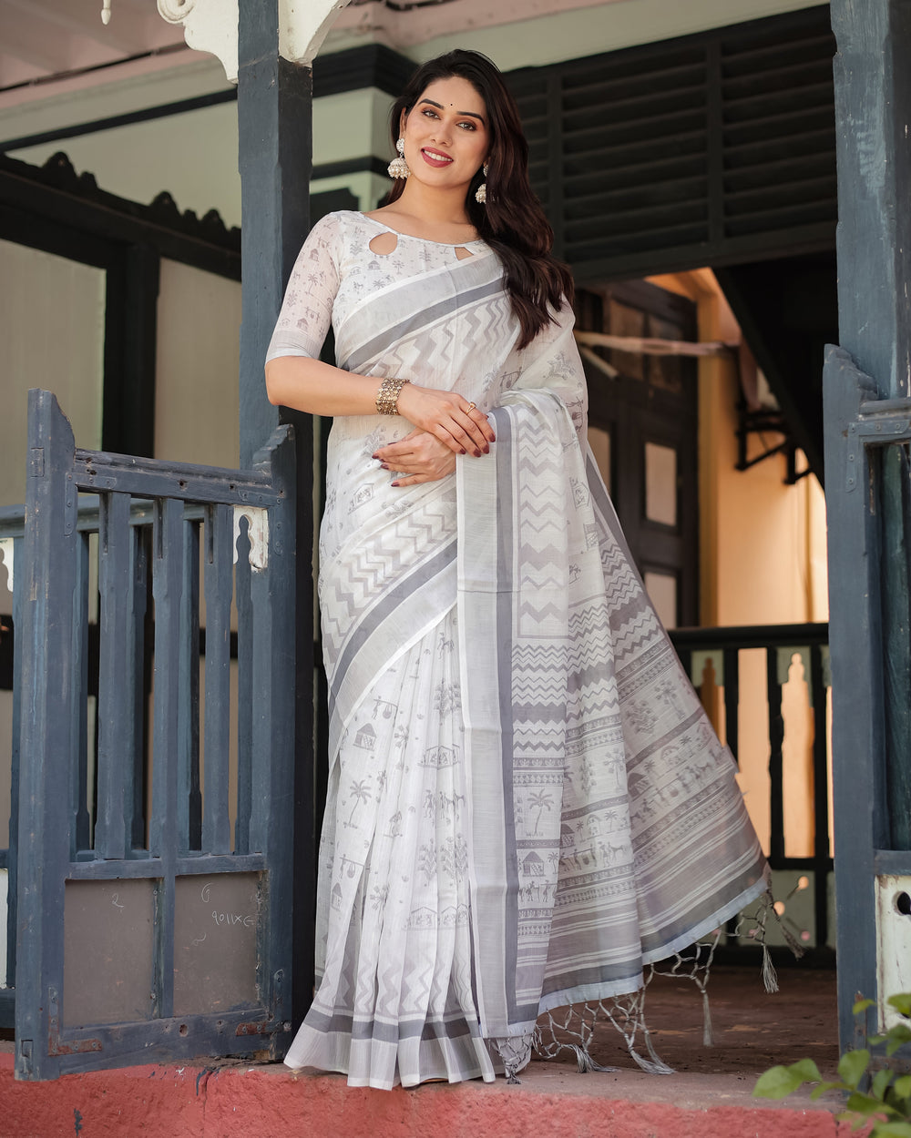 Elegant Pure Cotton Linen Saree with Intricate Grey and White Pattern, Complete with Blouse and Tassels