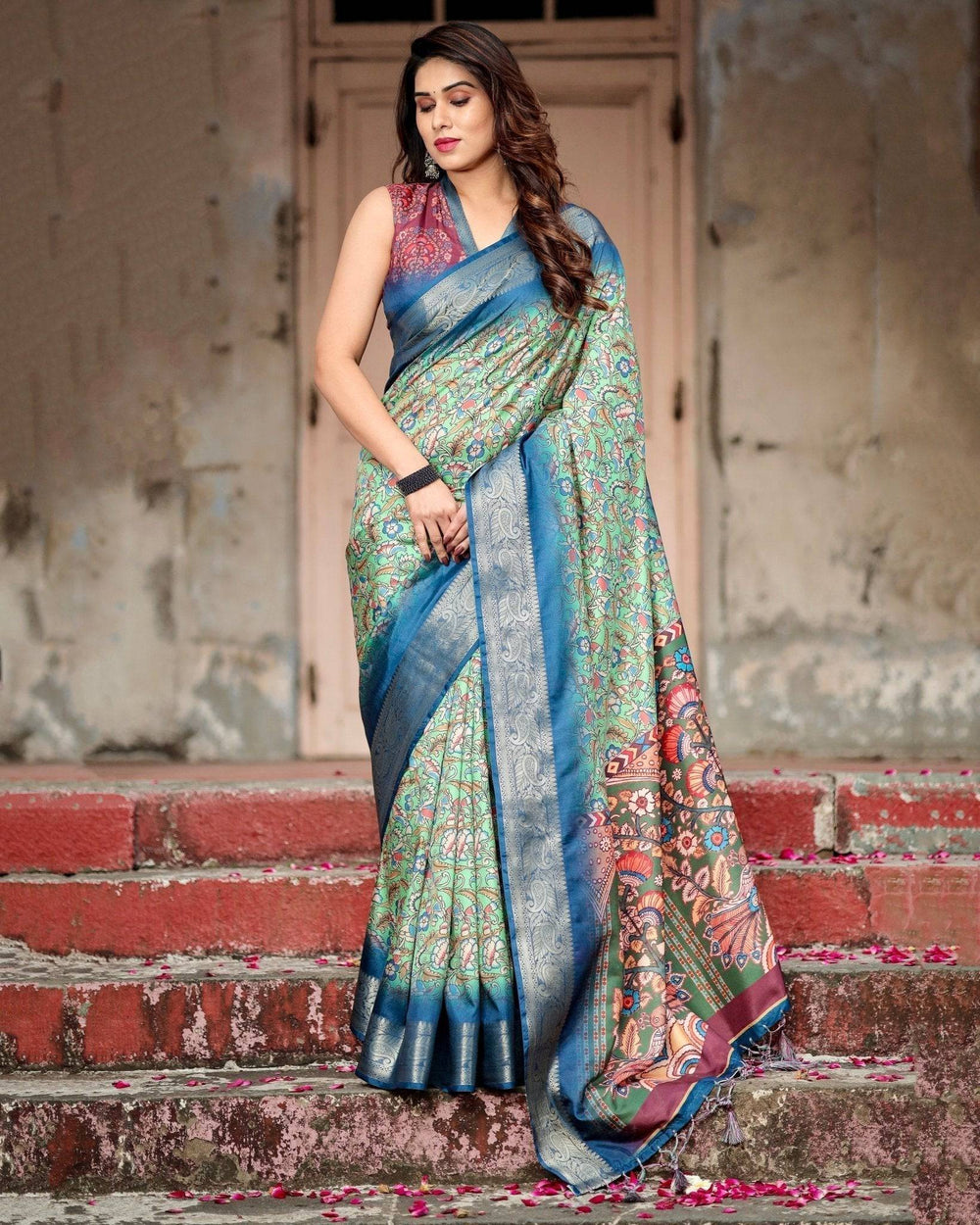 Majestic Blue and Green Digital Print Saree with Intricate Floral Motifs and Contrasting Pallu