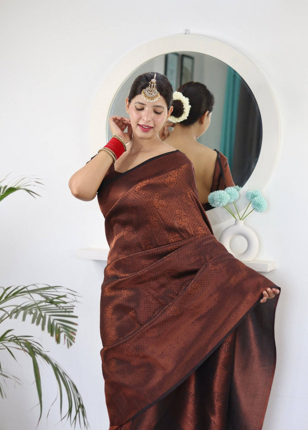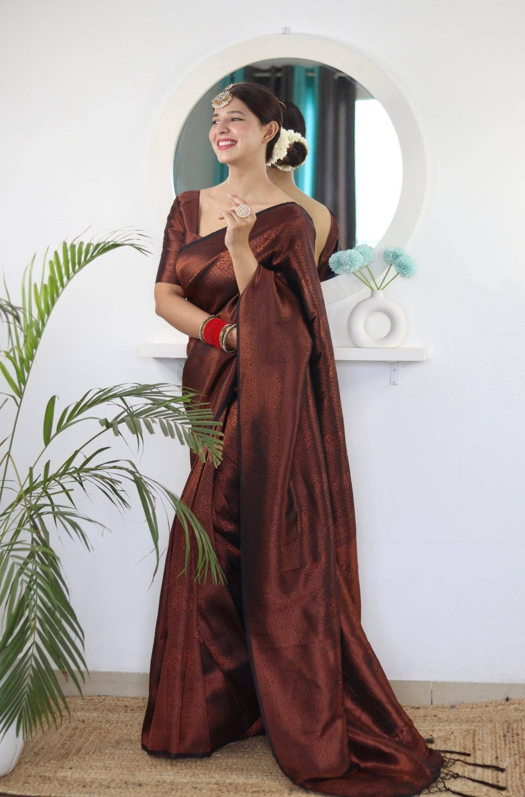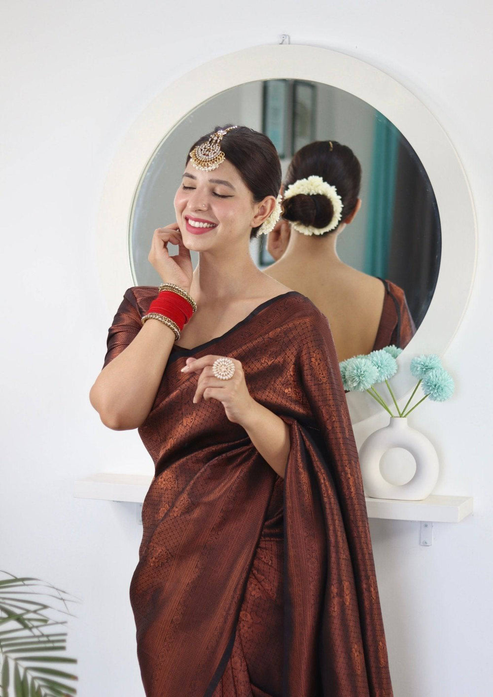 • Design: The saree features a sophisticated zari weave that adds a subtle shimmer and elevates its overall look.