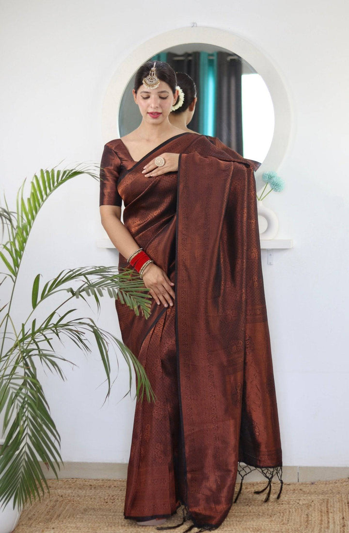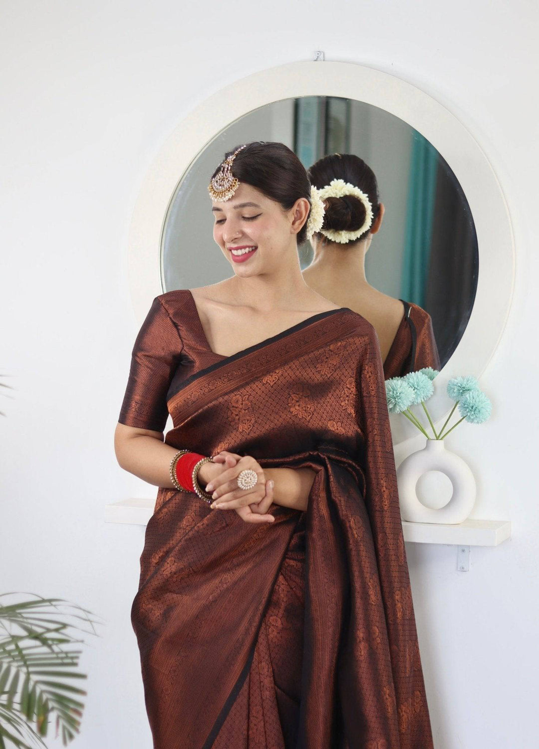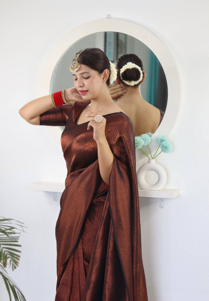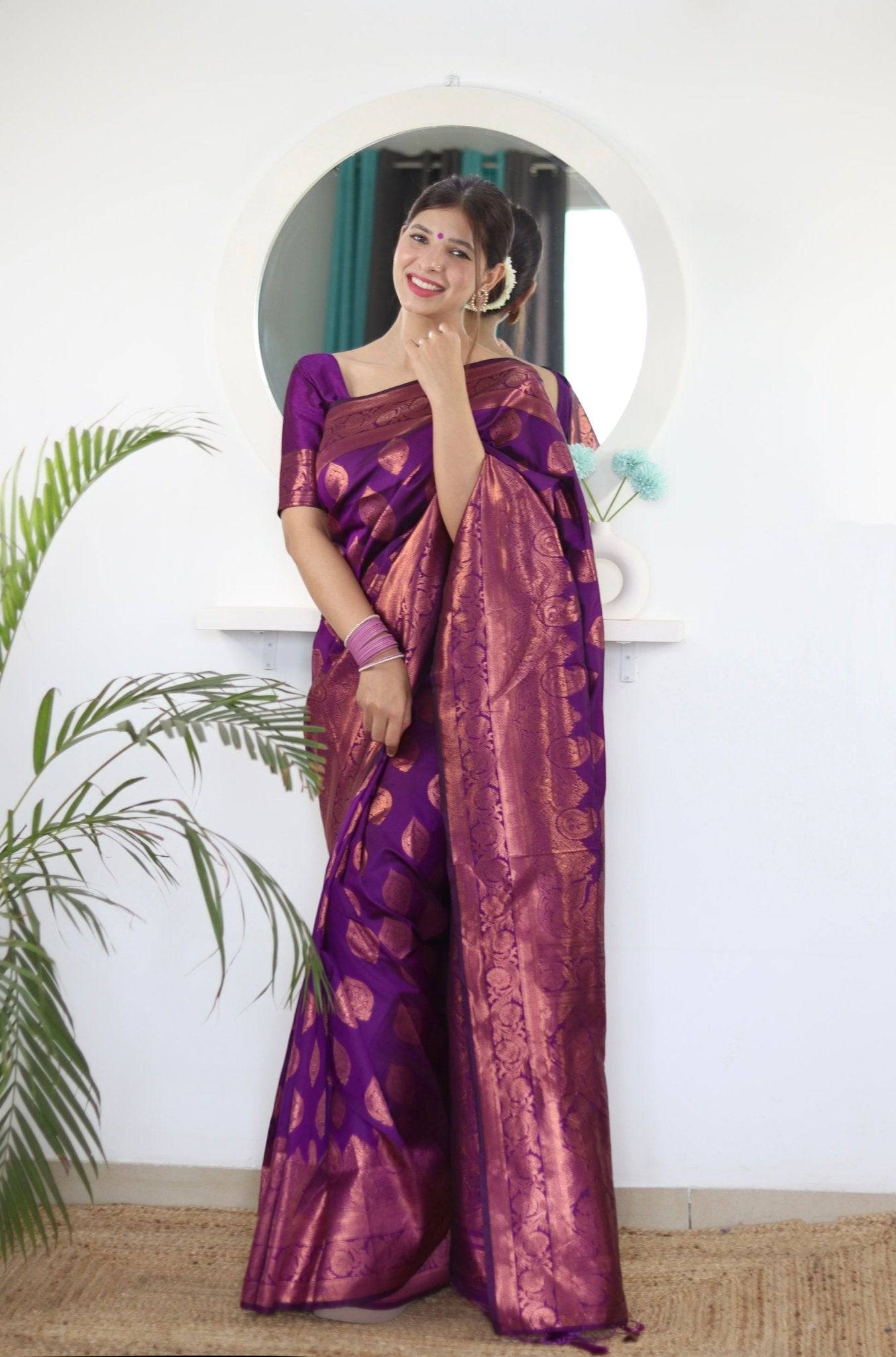 • Design: The saree features a sophisticated zari weave that adds a subtle shimmer and elevates its overall look.