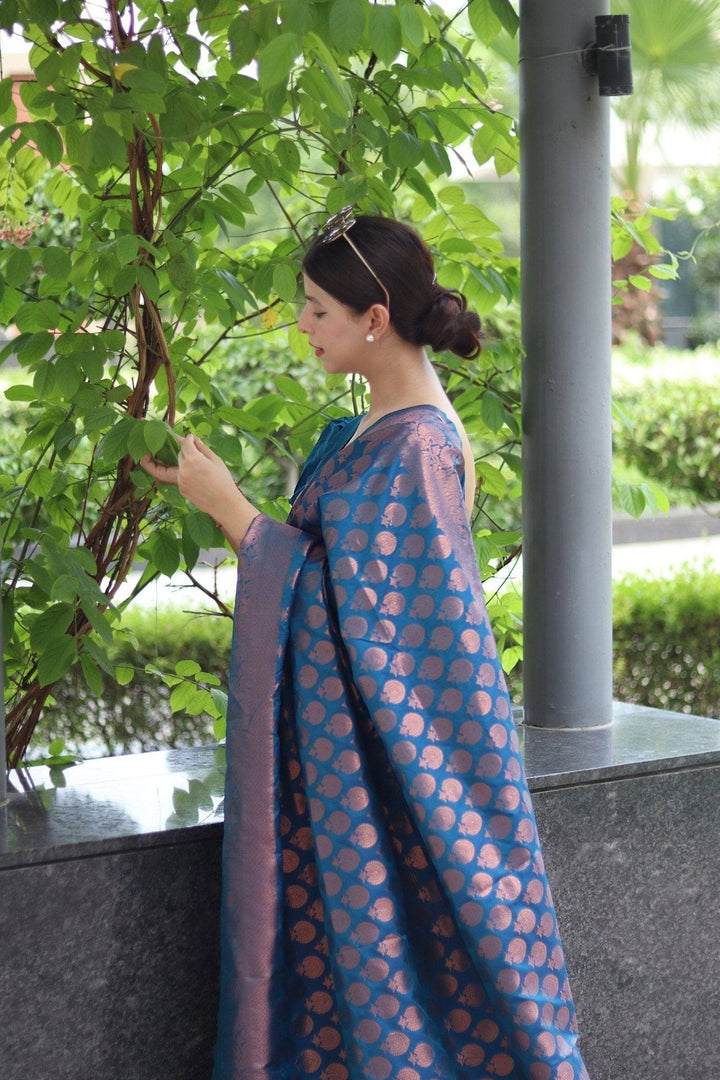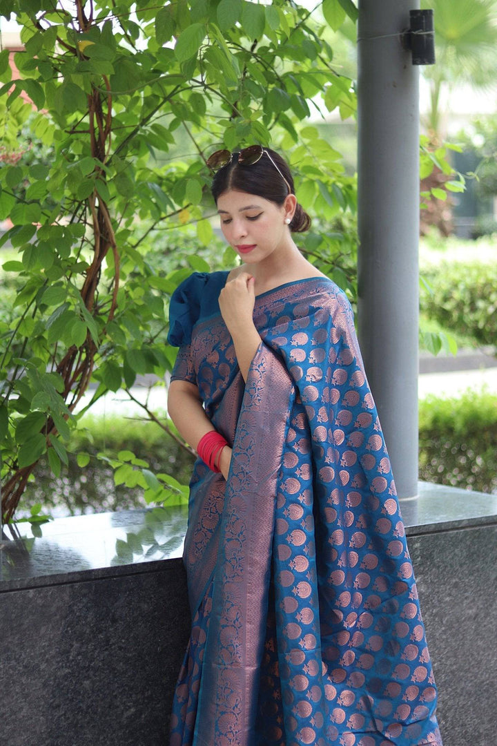• Design: The saree features a sophisticated zari weave that adds a subtle shimmer and elevates its overall look.