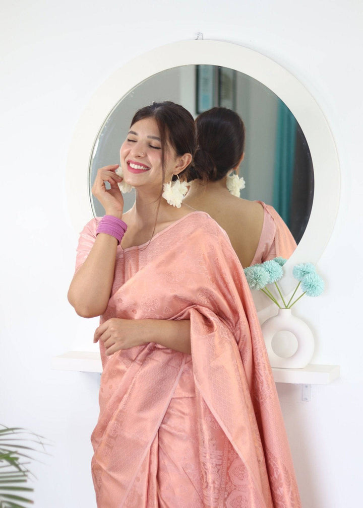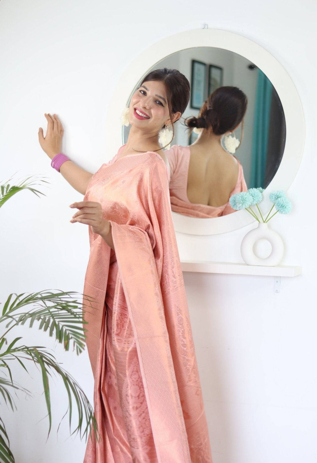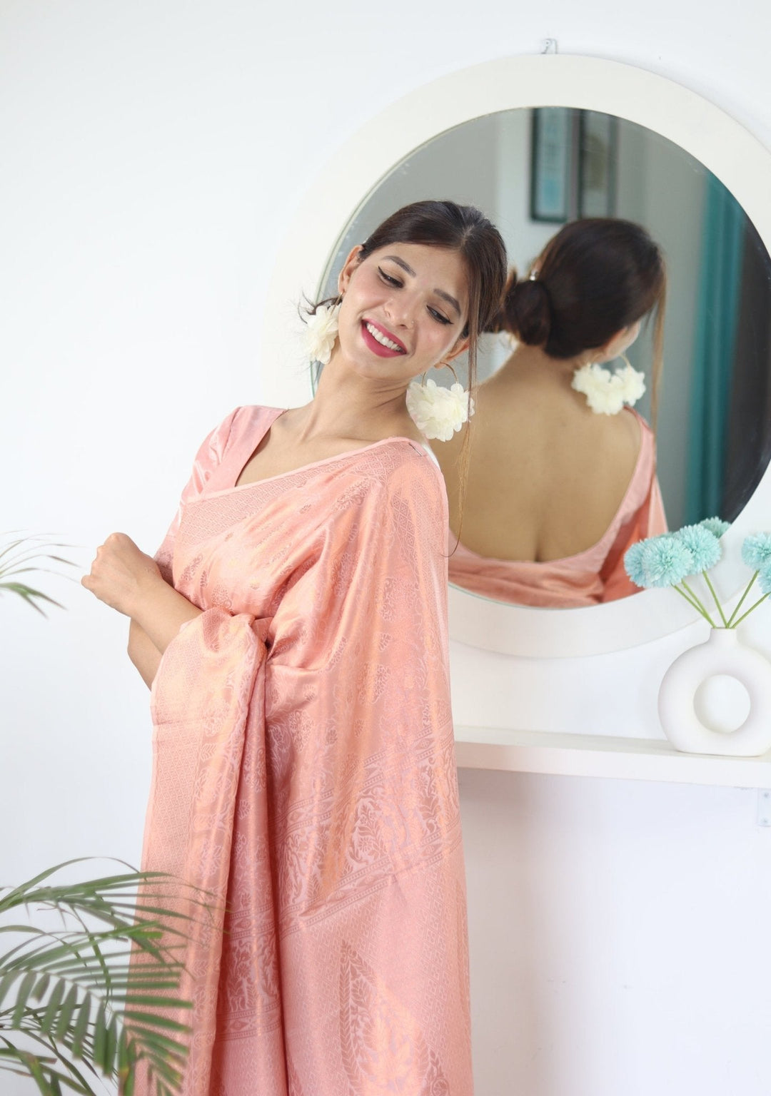 Peach Pure Satin Silk Saree With Snappy Blouse Piece - Almaari Fashion