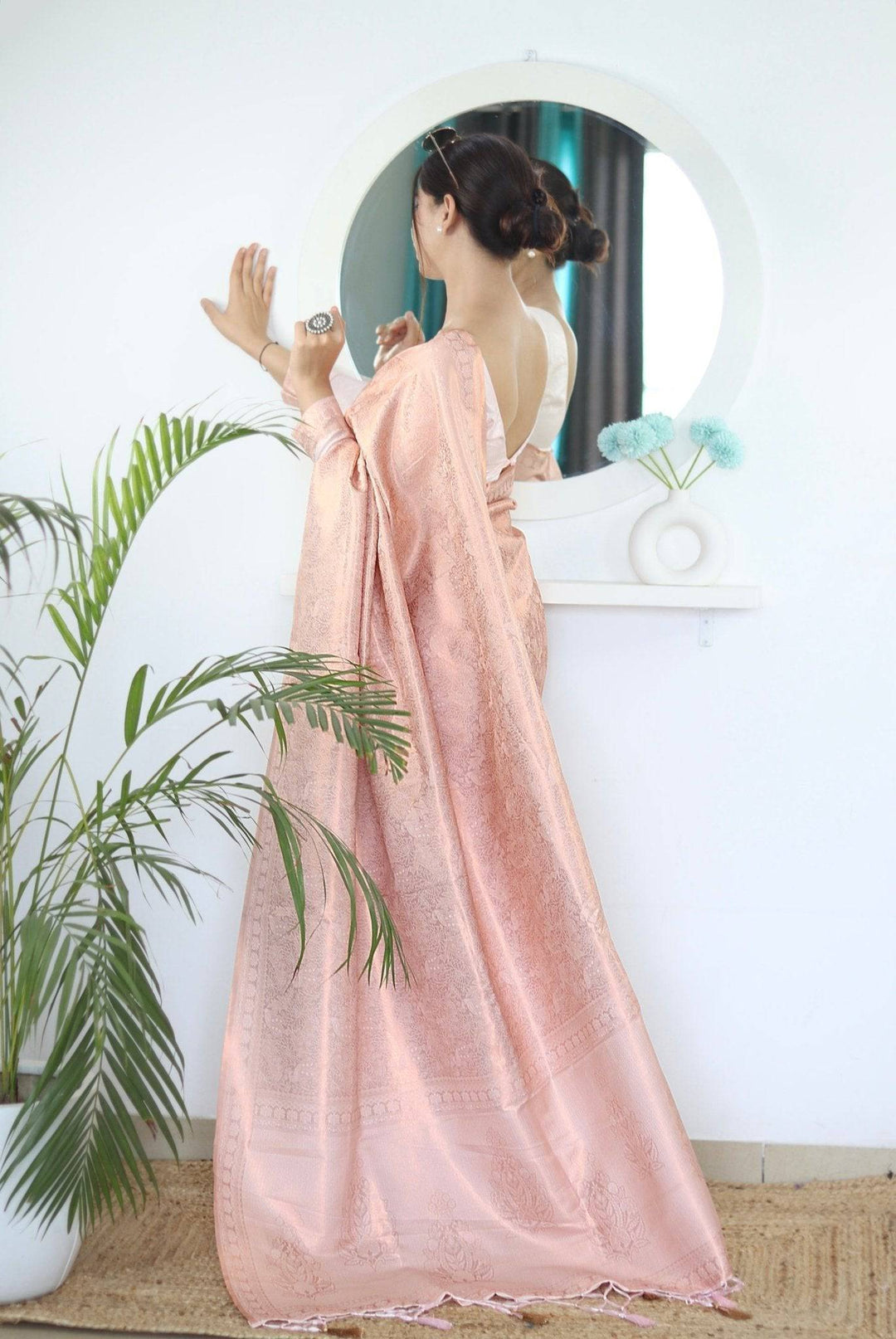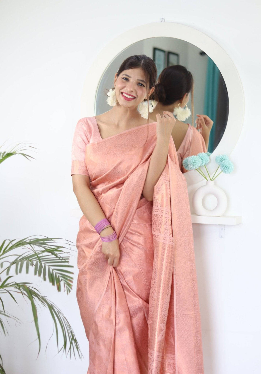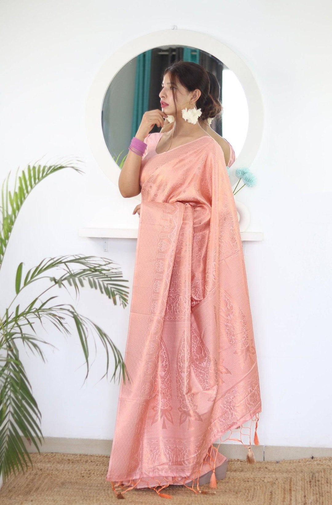 Peach Pure Satin Silk Saree With Snappy Blouse Piece - Almaari Fashion
