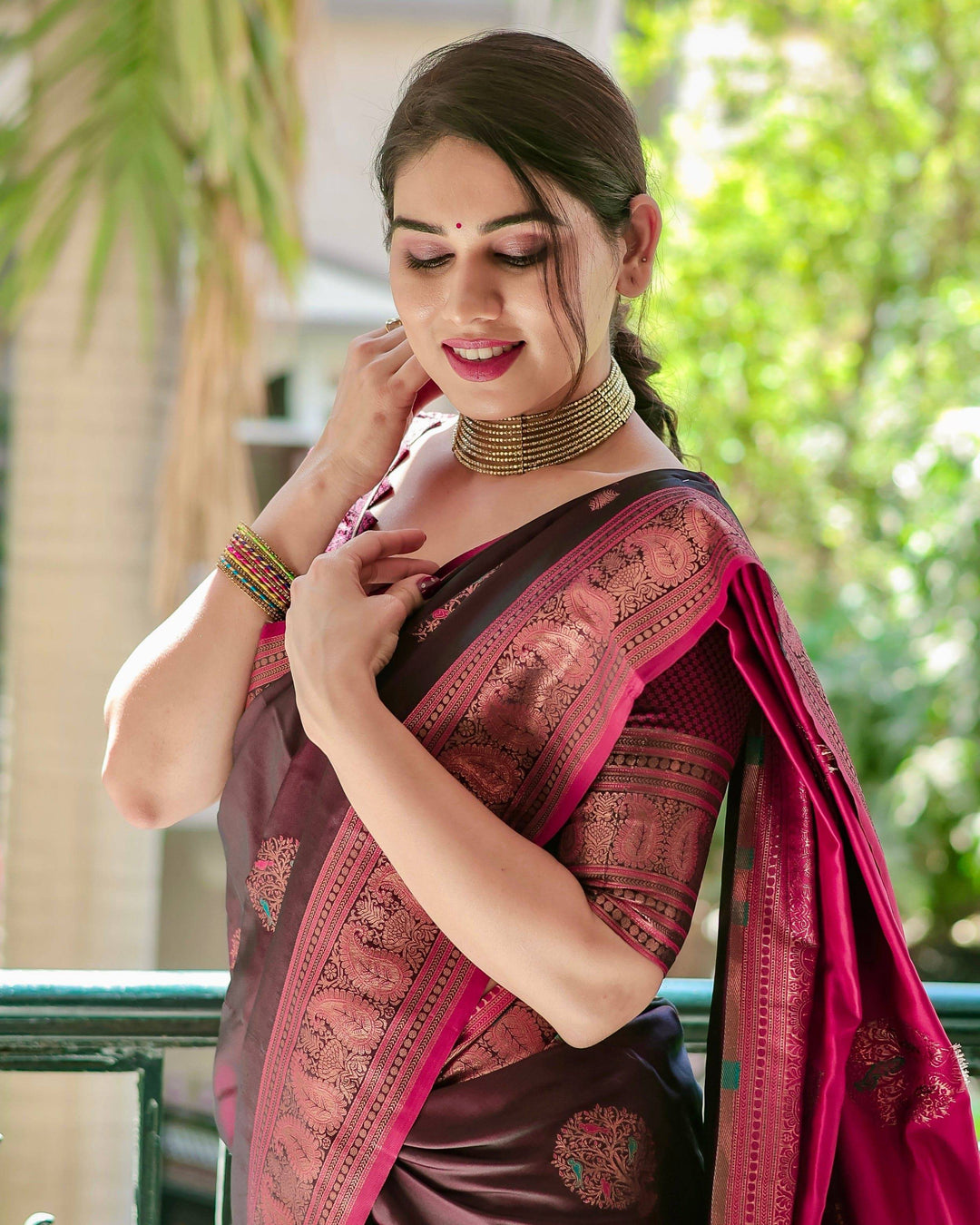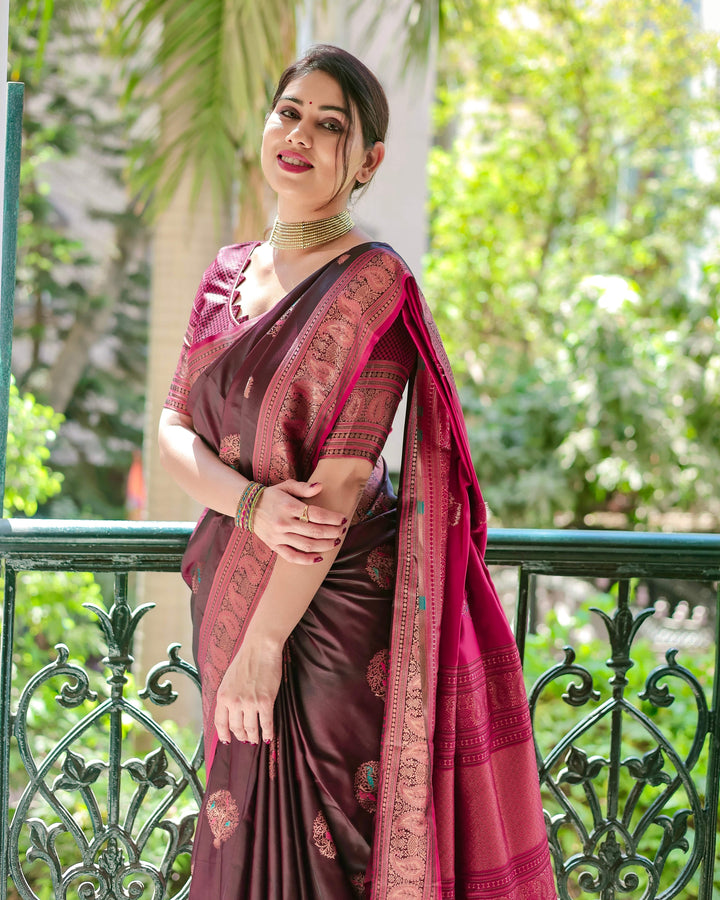 - Design: The saree features a sophisticated zari weave that adds a subtle shimmer and elevates its overall look.