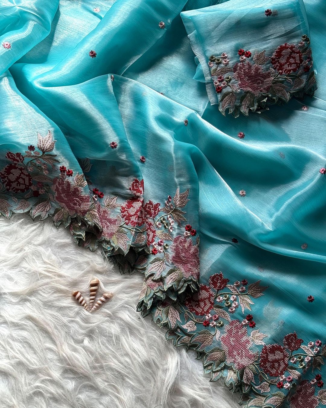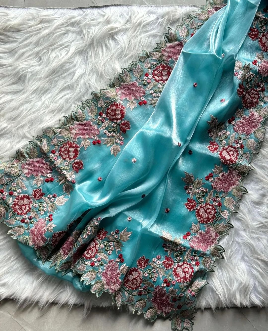 AQUA BLUE BURBARY JIMMY CHOO SHINY EMBROIDERY WORK SAREE WITH UNSTICHED BLOUSE