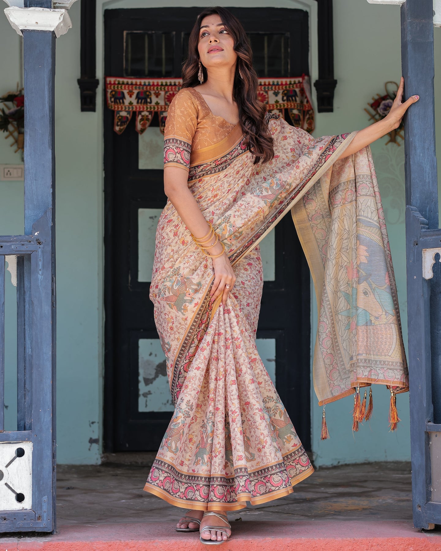 Beige & Maroon Handloom Cotton Saree with Floral Vine Print & Mythical Madhubani Cow Pallu
