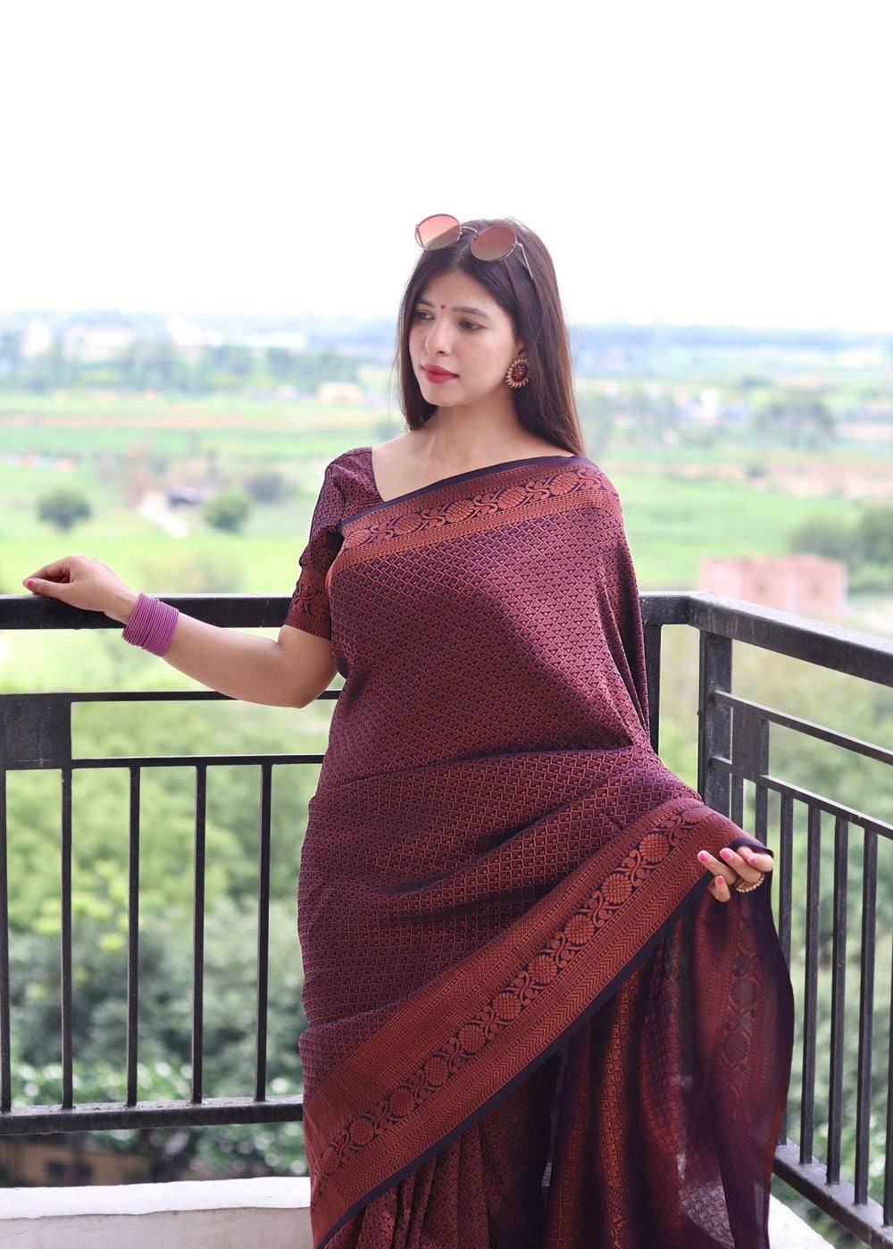• Design: The saree features a sophisticated zari weave that adds a subtle shimmer and elevates its overall look.