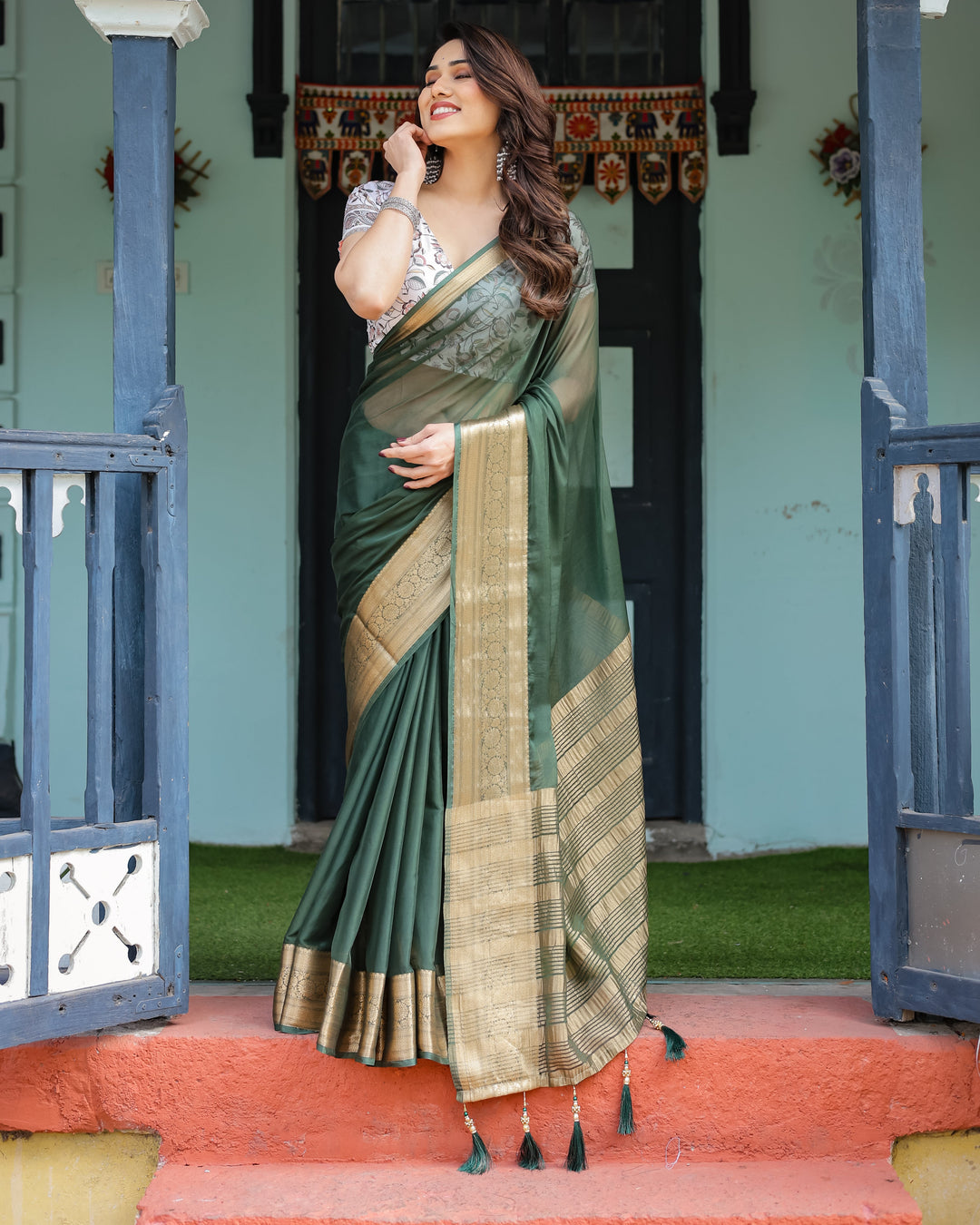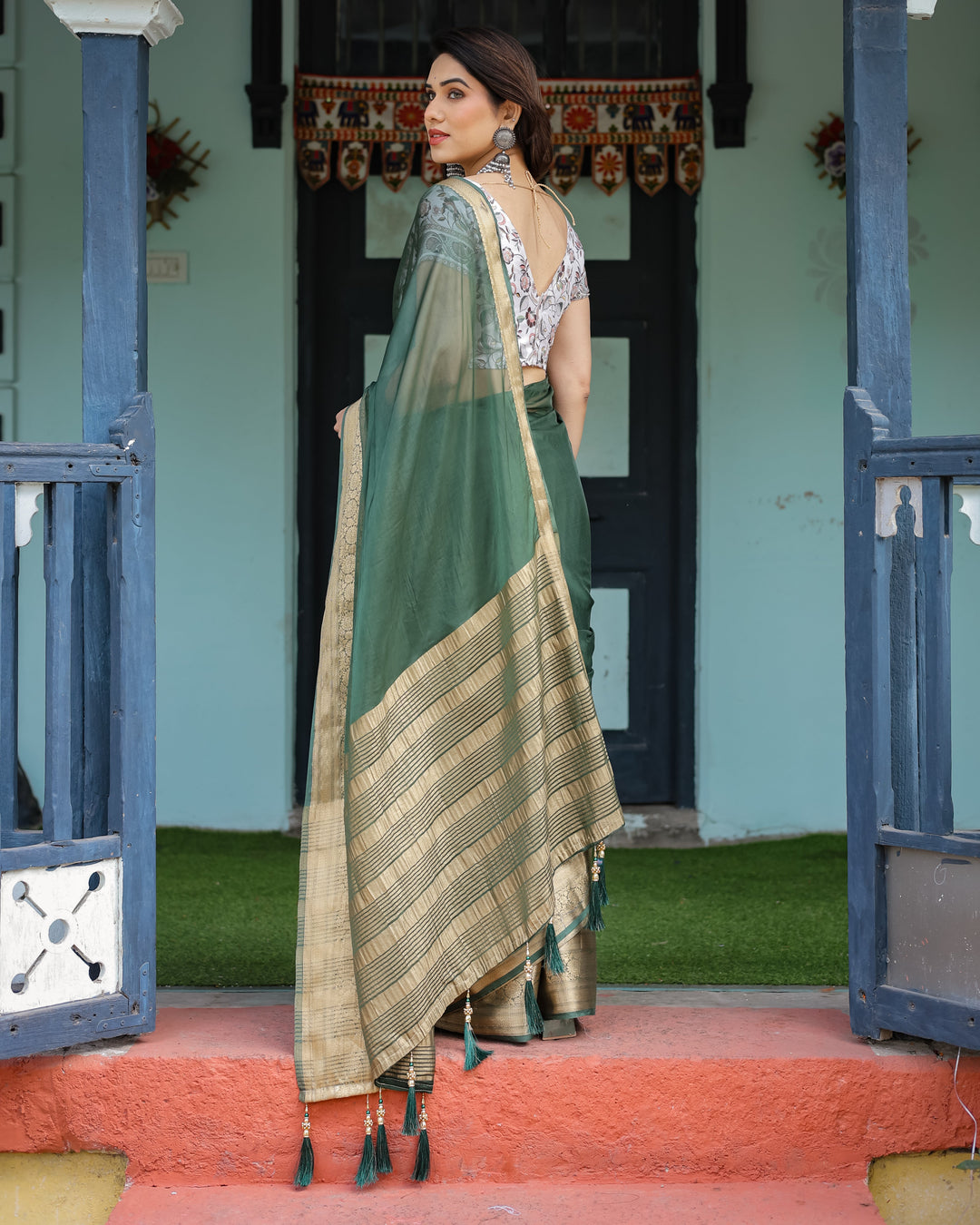 Elegant Bottle Green Plain Chiffon Saree with Gold Zari Border, Floral Printed Blouse & Tassel Finishing
