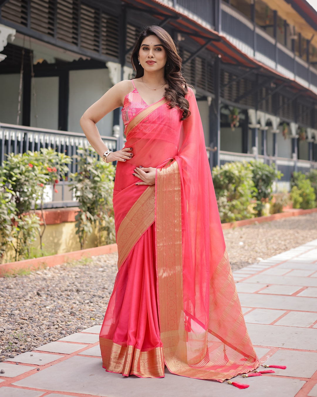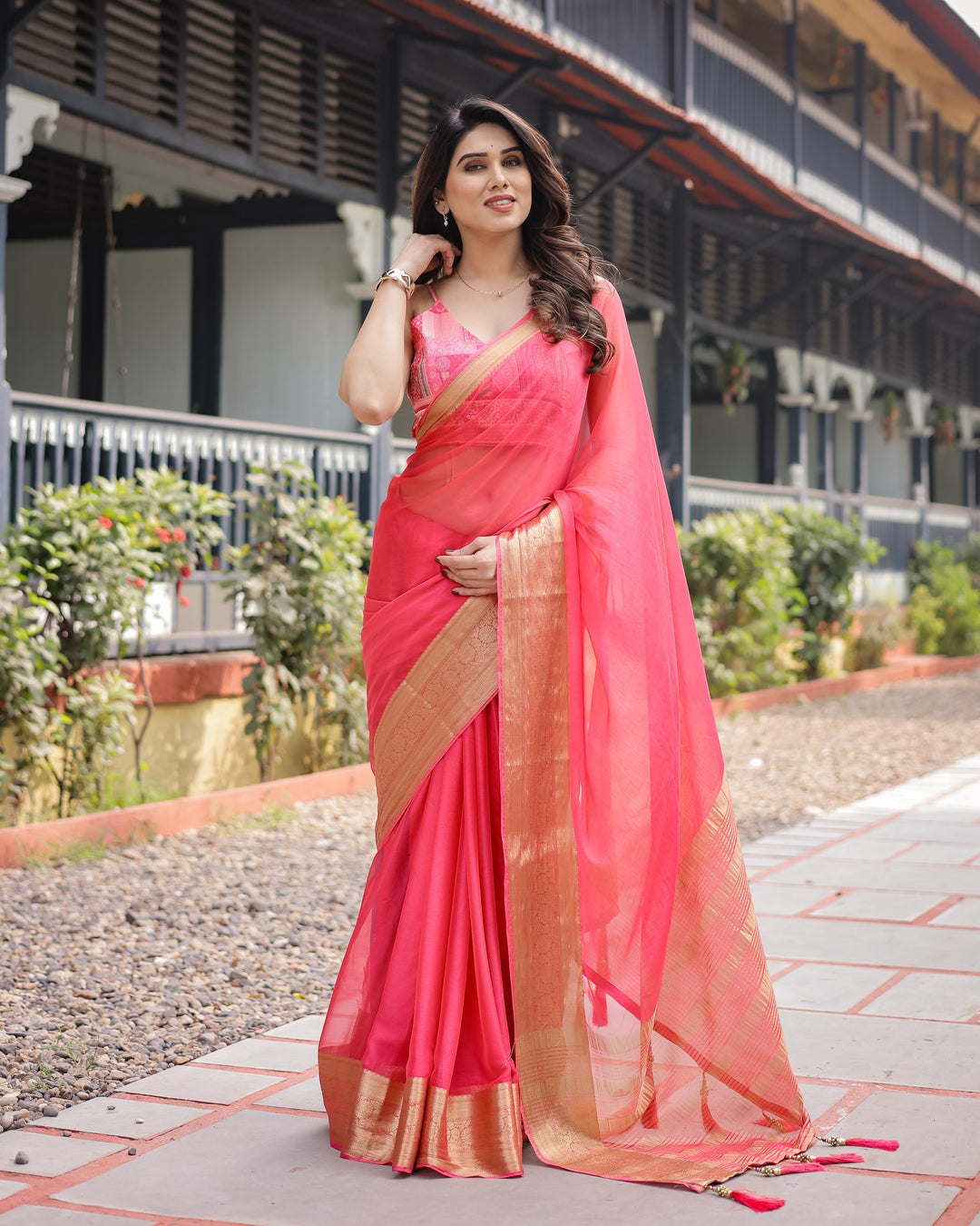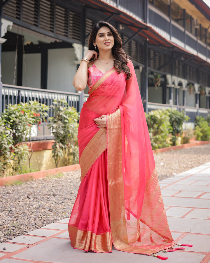 Flamingo Pink Plain Chiffon Saree with Gold Zari Border, Patterned Blouse & Tassel Detailing