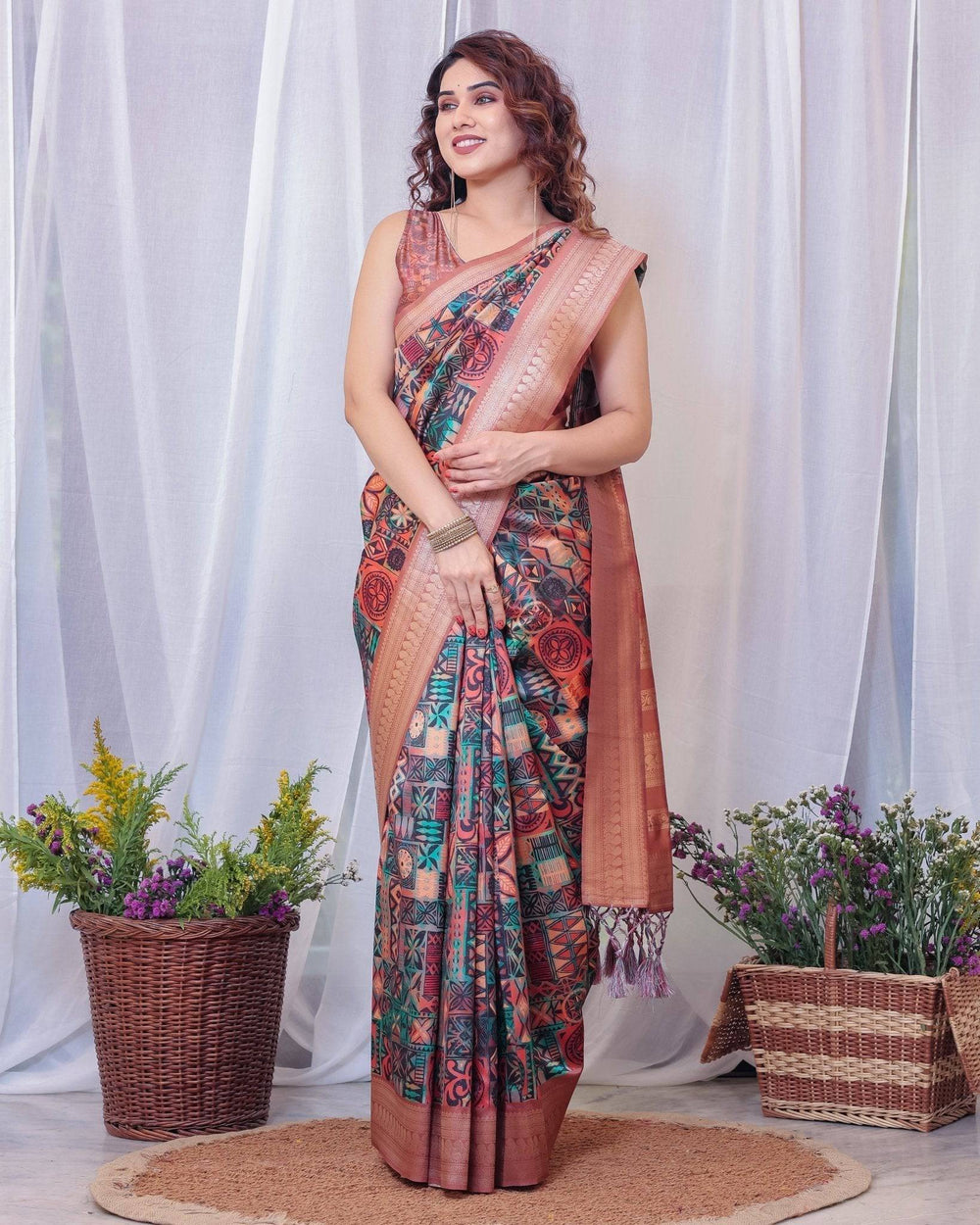 Step into a world of artistic allure with this multicolored pure silk saree, featuring vibrant geometric and tribal-inspired digital prints. The exquisite gold zari border and pallu add a touch of regal elegance, while the intricate tassel details enhance its traditional charm. Perfect for festive occasions, weddings, or cultural events, this saree seamlessly blends contemporary artistry with classic sophistication. Style it with statement jewelry and a chic blouse to complete the look. Draping this masterpiece ensures you stand out with a bold and graceful presence.