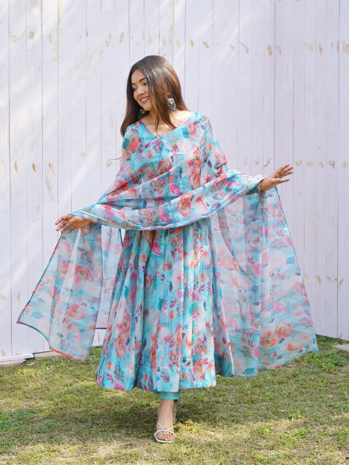 Tabby Organza Silk Fabric Fully Flared Kali Pattern with Canvas Patta, Dupatta Set, and Pant - Ready to Wear.