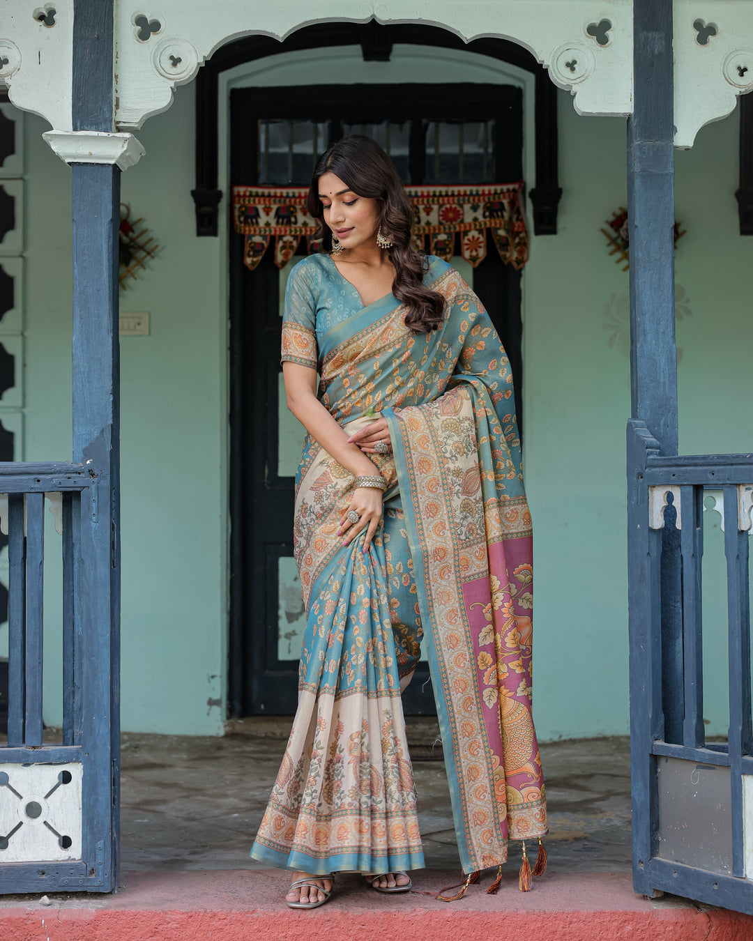 Turquoise Blue Handloom Cotton Saree with Multicolor Floral Pallu & Peach Border